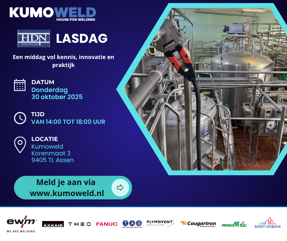 Naast de editie in Veghel brengt het Hygienic Design Network (HDN) de HDN Lasdag nu ook naar het noorden van het land, speciaal voor leden en relaties in deze regio. Samen met Kumoweld verwelkomen we u in Assen voor een middag vol kennis, innovatie en praktijk rondom hygiënisch lassen in de voedingsmiddelenindustrie.